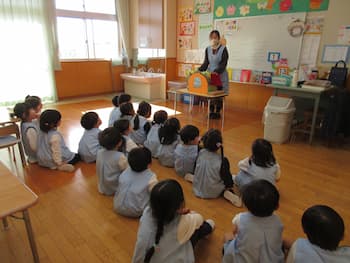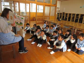 幼稚園の掲示板を見ながら、「ぼくはこの絵本見に行く・・」「○○ちゃん、一緒に行こう・・」と楽しみにしていた『おはなしタイム』。当日、子どもたちは、ワクワクしながら自分の見たい絵本の部屋に移動していました。
