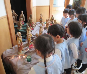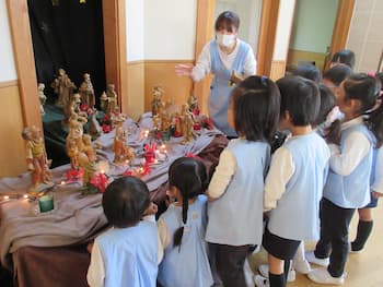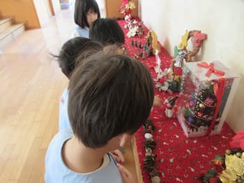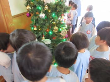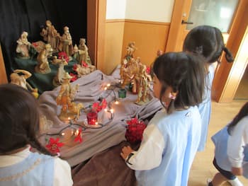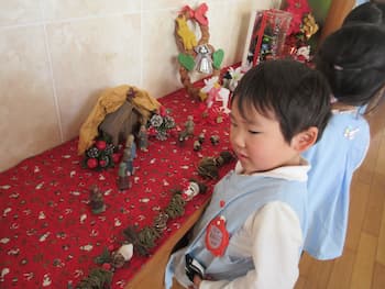 カトリックの教会では、クリスマスの4つ前の日曜日からクリスマスの準備をはじめ、この期間を待降節と呼んでいます。海の星幼稚園でも、クリスマスツリーや聖家族が飾られています。「まだ、イエス様はいないんだよ・・クリスマスはもうちょっとだから・・・」と、子どもたち同士の可愛いつぶやきが聴こえてきます。幼稚園でも、クリスマスに向けて、心の準備が始まりました・・・☆