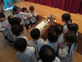 年少組さんのクリスマス発表会がありました。子どもたちは、園に飾られた聖家族を見ながらクリスマスを楽しみにしていました。そして、ダンスや歌の練習をみんなで力を合わせてしてきた『心』を、イエス様のお誕生のプレゼントにしようと心の準備をしながら今日を迎えました。