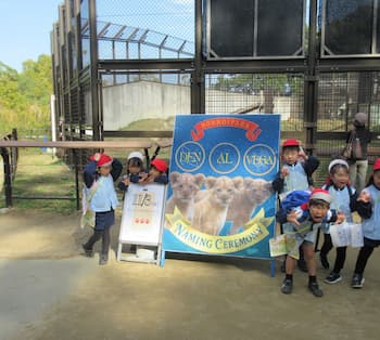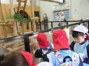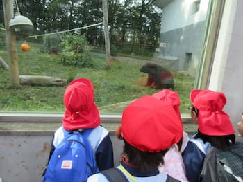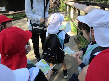それぞれ自分たちで作った地図を手に持ち、先生とグループで活動開始!!「こっちだね」と、子どもたち同士で地図を見て確認して進んでいました。そして、「ライオン、赤ちゃんと一緒にいる・・」「かば、大きい!!」「毛がふさふさだね・・」と、みんなで楽しみながら園内を周っていました。一人ひとり、自分で一番みたい動物を決めていたので、じっくり観察する姿もありました。