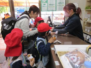 お昼は、全員でランチタイム!!手作りのお弁当、美味しいね!!そして、「駄菓子屋、海の星」で、自分たちで買ったお菓子も「あっ、それ僕と一緒・・」など友だちと話しながら食べていました。午後は、また活動開始・・。帰りには、お店に寄って、一人ひとり自分で選んだお土産を自分でお金を払って買ったね。大切そうに持ち帰りました。