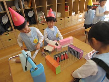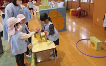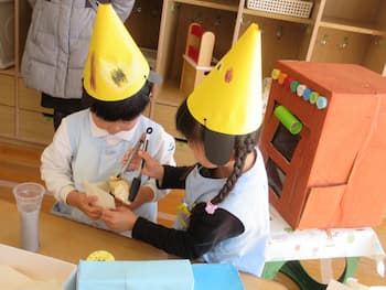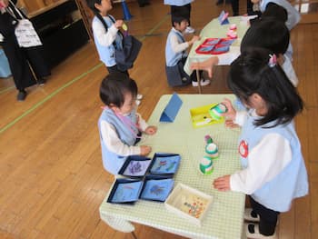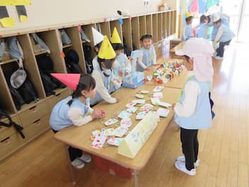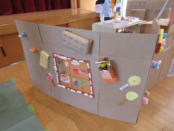 「考えたり工夫したり・・友だちと育ちあう・・」を大切に過ごしてきたまとめとして、園全体で楽しんだごっこあそび!!今年も、こどもたちのアイディアいっぱいの年長さんの『お話の世界』、年中さんと年少さんの『お店屋さん』!!メロンパンも手作りオーブンで焼いて販売していたり、キーホルダーはバックにつけれるるようになっていたり、年長さんのお話の世界では、案内係や受付係、お土産を渡す係など自分たちで役割分担していたり、年少さんに丁寧にルール説明していたり・・・こどもたちが遊びに主体的に関わり、次の日も次の日も・・・あそびが続きました。