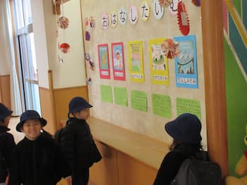 3学期が始まった次の日・・・子どもたちが登園すると、『お話タイム』の掲示がありました。2学期にも行ったお話タイムを思い出しながら、子どもたち同士で「今度は、このお話にしよう・・○○ちゃんも一緒に見る?」と、楽しみにしていました!!